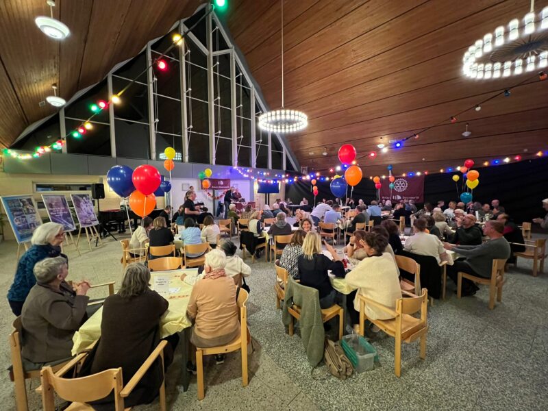 De zaal van de Ontmoetingskerk in Doorwerth was voor deze avond omgetoverd tot de gezellige ‘Rotary Doorwerth Pubquiz Zaal’.